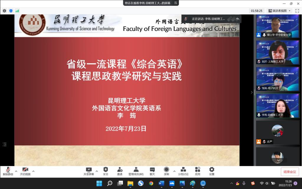 7月22-23日,由教育部高等学校外语专业教学指导委员会英语专业教学指导分委员会主办、成都理工大学承办的第十九届全国理工院校英语类专业教学研讨会暨第四届院长/系主任联席会议在线上举行。昆明理工大学皇冠博彩app下载