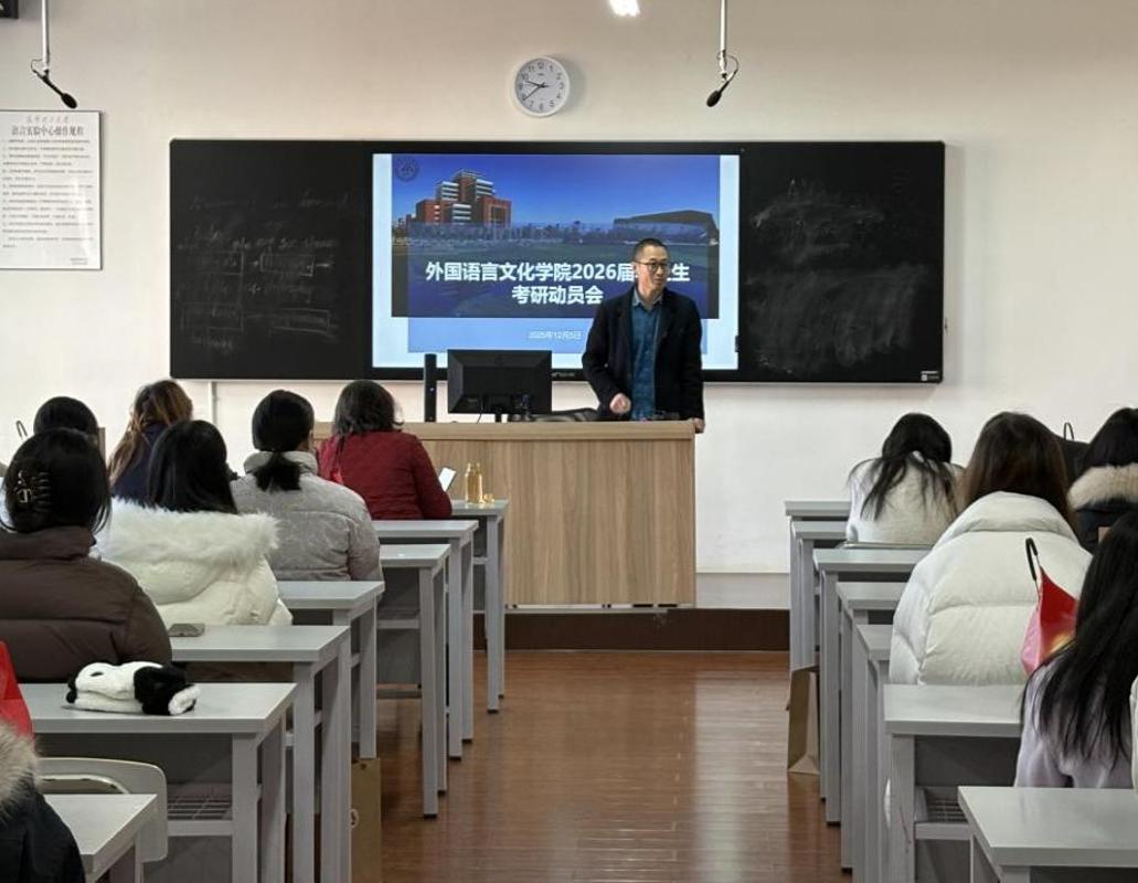 为鼓舞考研学子士气,坚定备考信心,12月5日上午,外国语言文化学院2026届毕业生考前动员大会在博文楼403举行。学院党委书记刘建平、院长王英、党委副书记孙冠华、辅导员刘芋蔓,以及2026届全体考研学子参加活动,活动由孙冠华主持。
