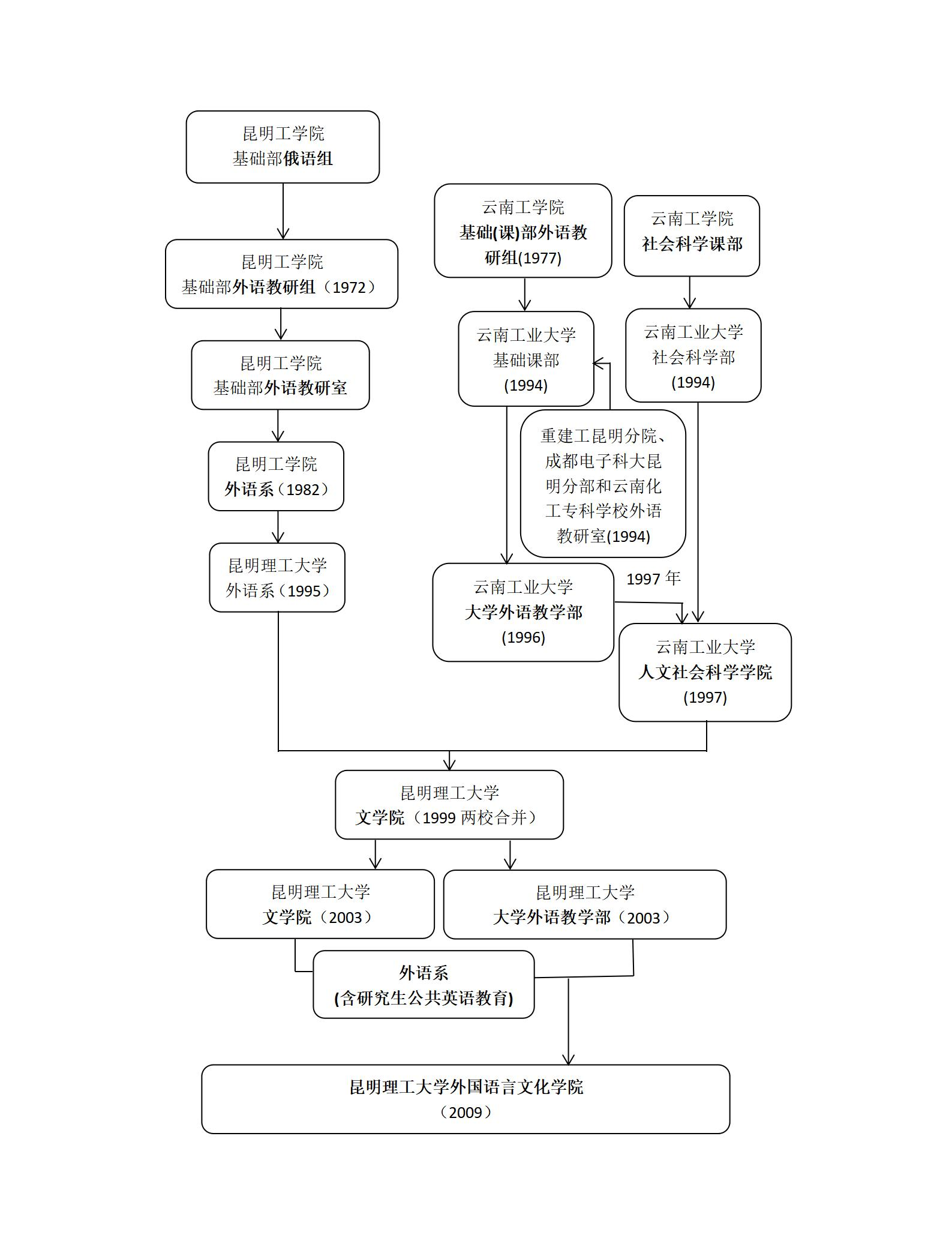 1994年,云南工业大学成立,重庆建筑工程学院昆明分院、成都电子科大昆明分部和云南化工专科学校外语教研室并入云南工业大学基础课部;