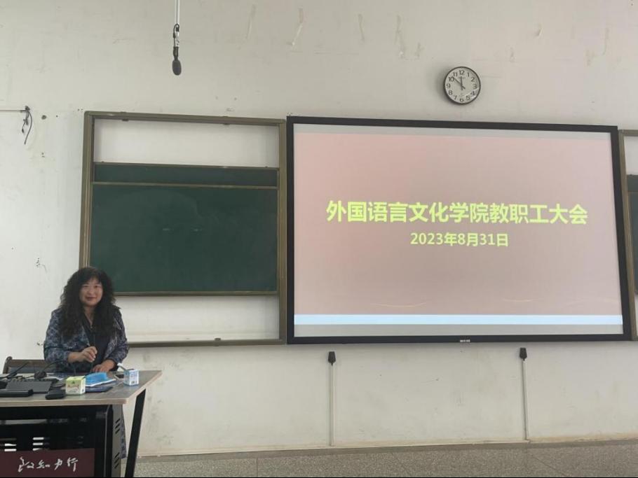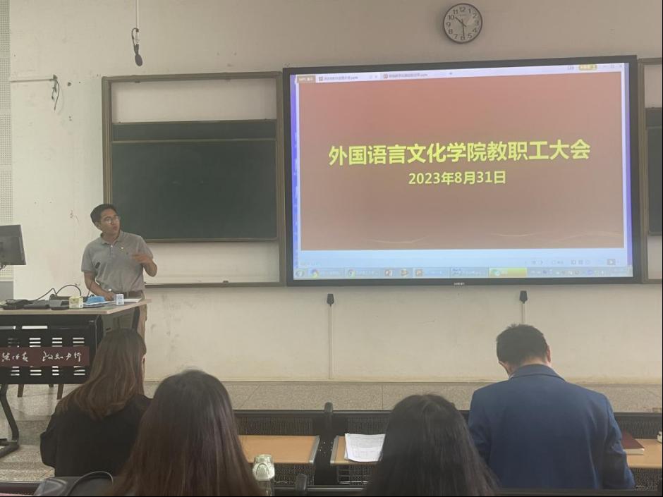 8月31日上午,外国语言文化学院召开教职工大会。会议由王英院长主持,全院教职工参加会议。