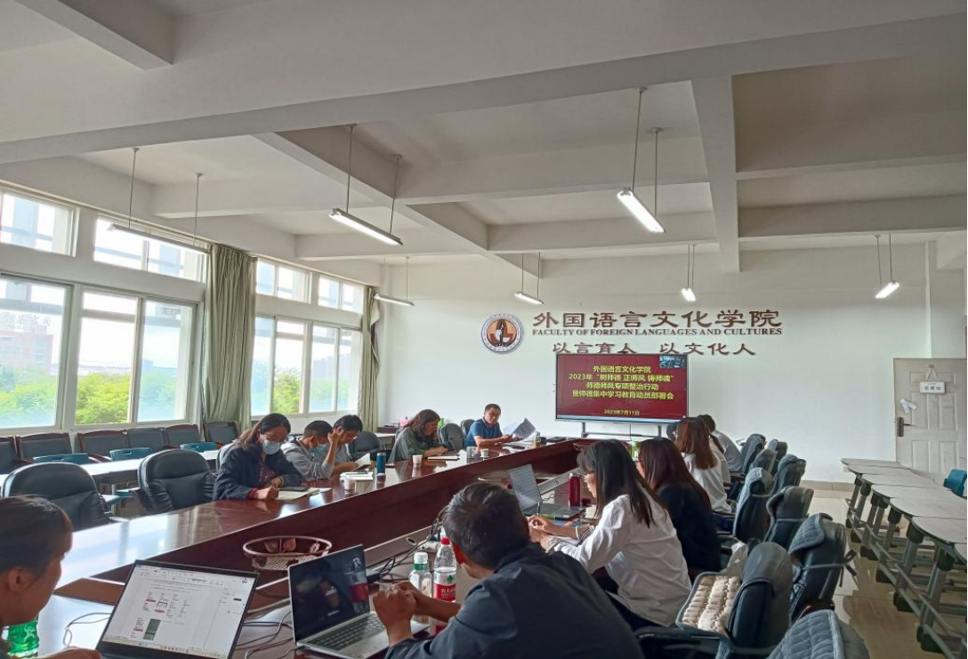 7月11日,外国语言文化学院在博文楼312召开2023年“树师德、正师风、铸师魂”师德师风专项整治行动暨师德集中学习教育动员部署会。会议由学院党委书记刘建平主持,全体教职员工通过线下和线上方式参加会议。