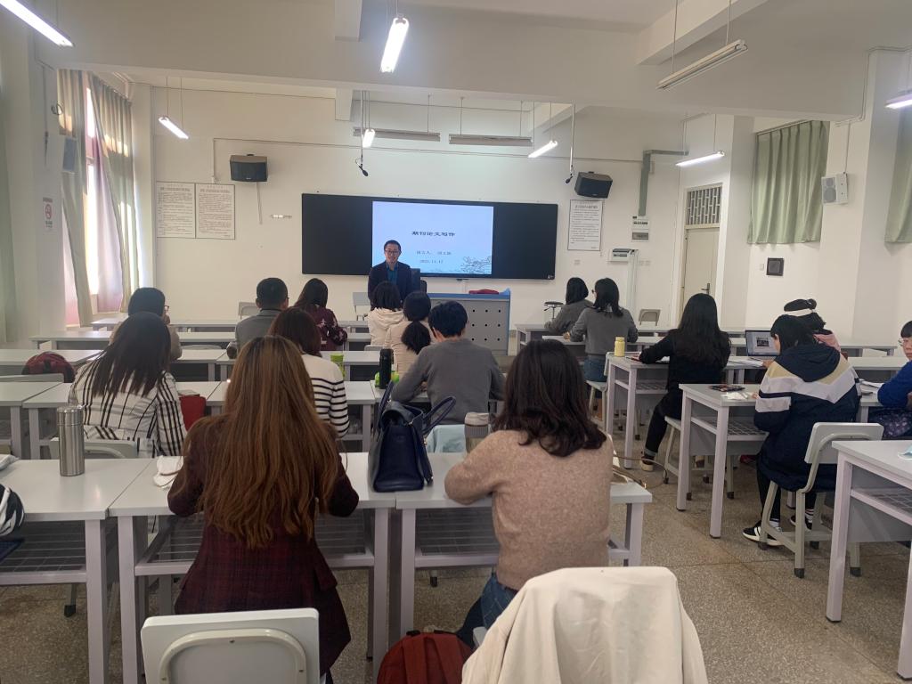 来自大学外语部的邱文颖老师以《期刊论文写作》为题,和在场老师们分享了她关于中文核心期刊发表的历程和经验。邱老师首先就文章选题的前沿性、精深性和系统性进行阐述,然后以自己已发表的核心期刊论文为例从论点、摘要、正文和结论分别介绍了期刊写作要点。最后,详细解释了核心期刊匿名评审的步骤以及应对技巧。邱老师的经验分享非常实用,得到在场老师们的赞赏。