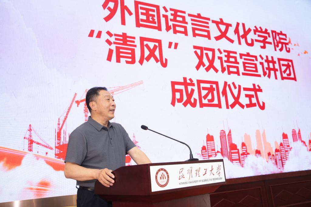 陶光荣为“清风”双语宣讲团授旗并发表讲话。陶光荣指出,“清风”双语宣讲团的成立,是落实“清廉学校”建设、加强“不想腐”建设的重要举措,对于落实立德树人任务有重要意义。