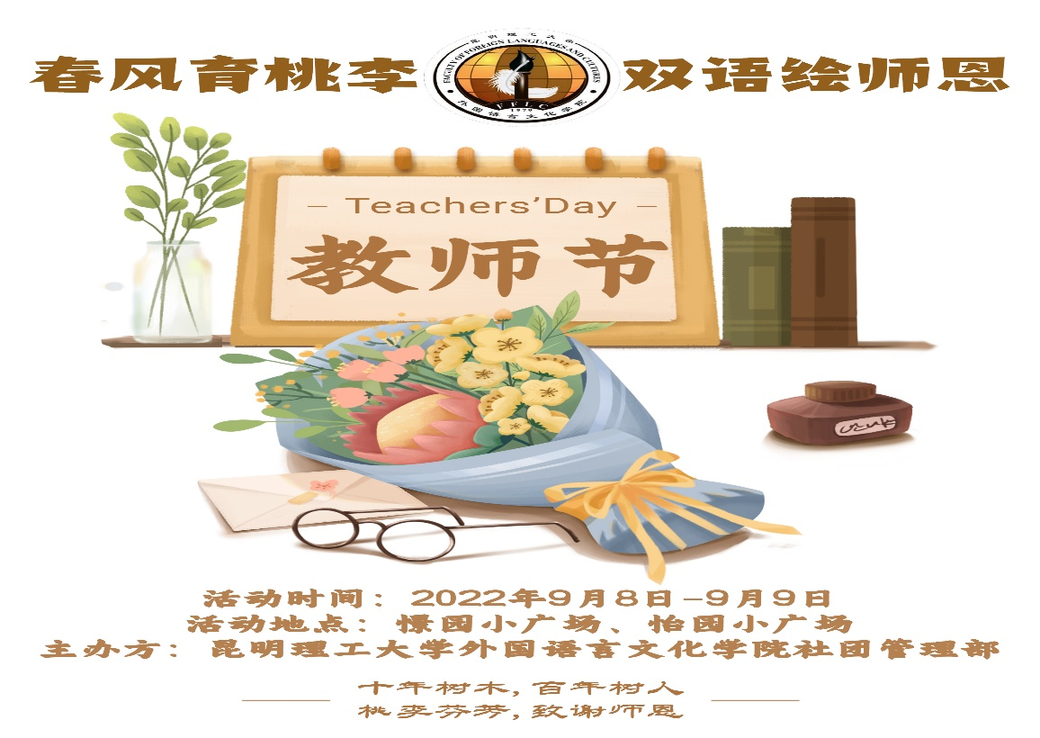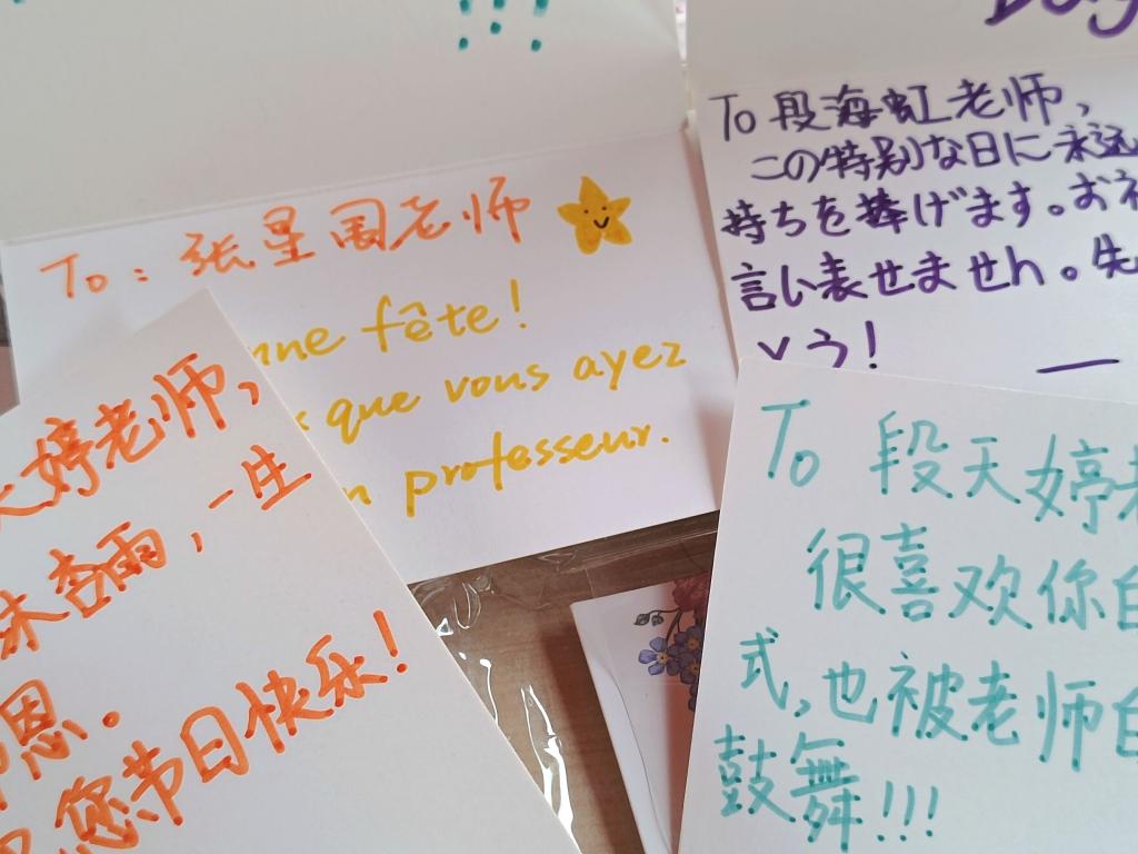 、各个专业的学生踊跃参与并发挥创意,用中文分别搭配英语、法语、德语、韩语、日语写下对老师们的感谢与祝福,由学生社团管理部将贺卡递送到每一位外语教师手中。