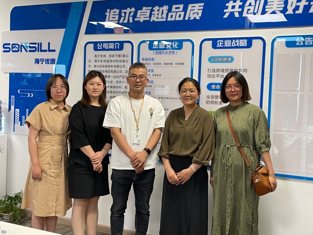 )2005届英语专业毕业生,于2015年创建海宁优微装饰材料有限公司,现任公司总经理。陆宏勇总经理对团队的到来表示欢迎,带领团队参观了企业,详细介绍了企业资质、发展历史、业务范围等内容,解读了海宁市现行的人才引进政策,剖析了海宁市及周边地区外贸行业的发展现状与前景,以企业现有的发展情况和人才需求情况为例,提出了外贸型企业对人才培养的具体建议。团队成员与陆宏勇总经理就毕业生就业情况、人才培养方向、学生实习实践方案等内容进行了充分的沟通交流。陆宏勇总经理对我院毕业生的综合能力深表认可,希望双方持续加强在产教融合、创新创业教育等方面的合作,实现校企双方高质量发展。