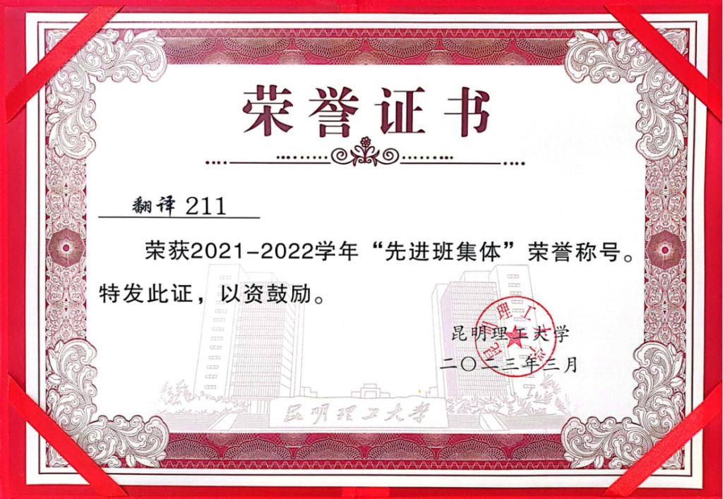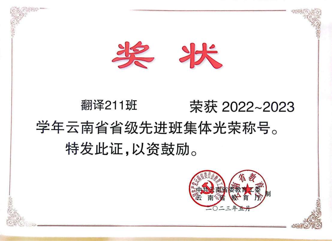 2021级本科专业翻译211班荣获2022-2023学年云南省“省级先进班集体”,这是我院近十年来第一次荣获“省级先进班集体”荣誉。