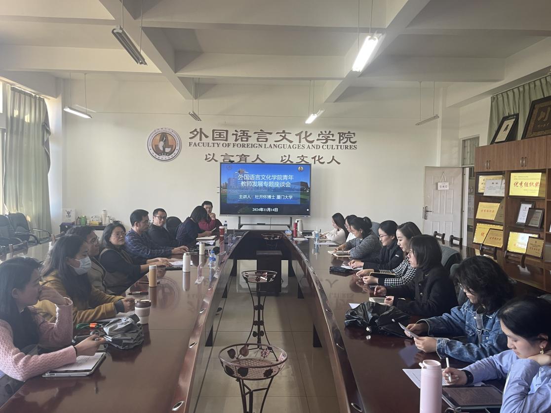 各位新进青年教师代表就个人教学、科研与管理工作等情况进行自我介绍。其次,杜开怀就自身职业发展规划与经历、高校英语教学发展理念与路径、教学中的学生需求与回应等方面进行发言并与新进教师代表展开交流。杜开怀指出,科研工作应具有对接国家战略需求的眼光,建议皇冠博彩app