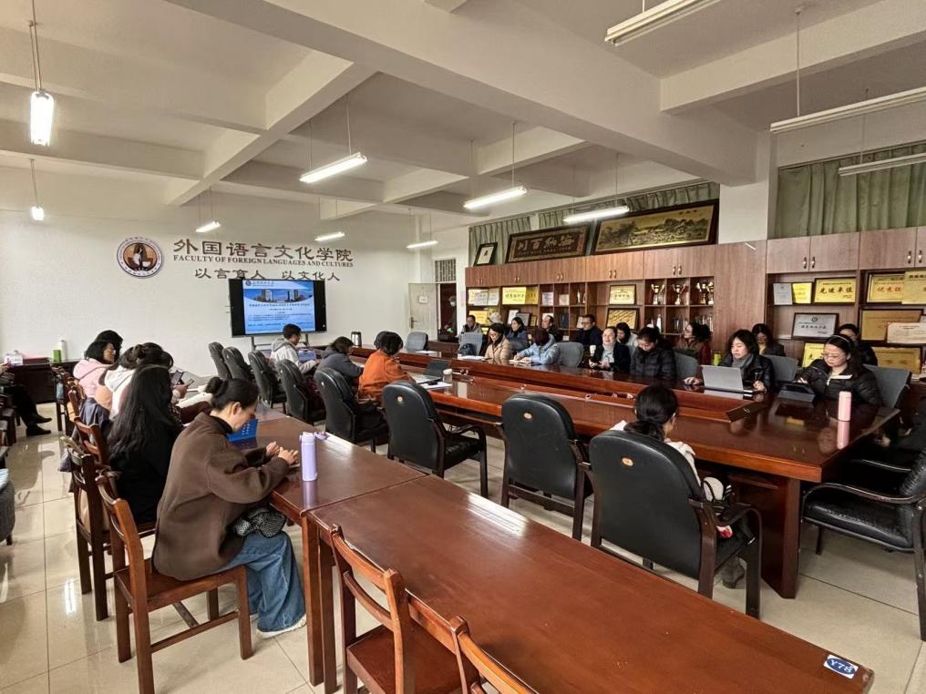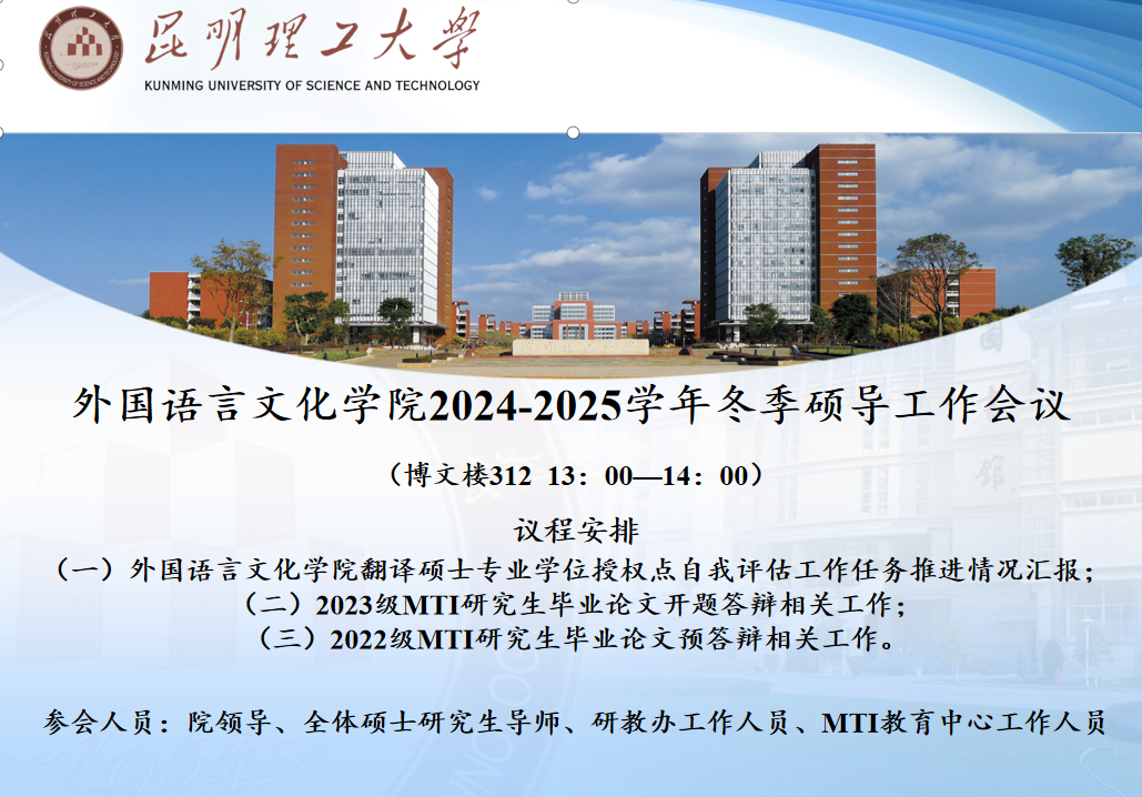 在博文楼312召开2024-2025学年上学期学期末硕导工作会议,总结翻译硕士专业学位授权点自我评估工作,安排2023级研究生毕业论文开题及2022级研究生毕业论文预答辩工作。王英院长、李泽生副院长、马倩副院长、皇冠博彩app
