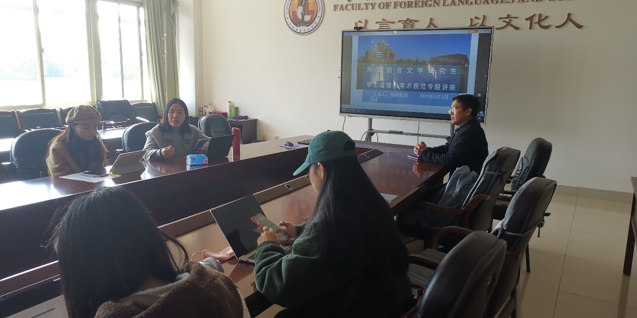 在博文楼312会议室举办了研究生学术道德和学术规范专题讲座。本次讲座由杨燕博士、教授主讲,李泽生副院长主持,2023级外国语言文学专业全体学生参加了此次活动。