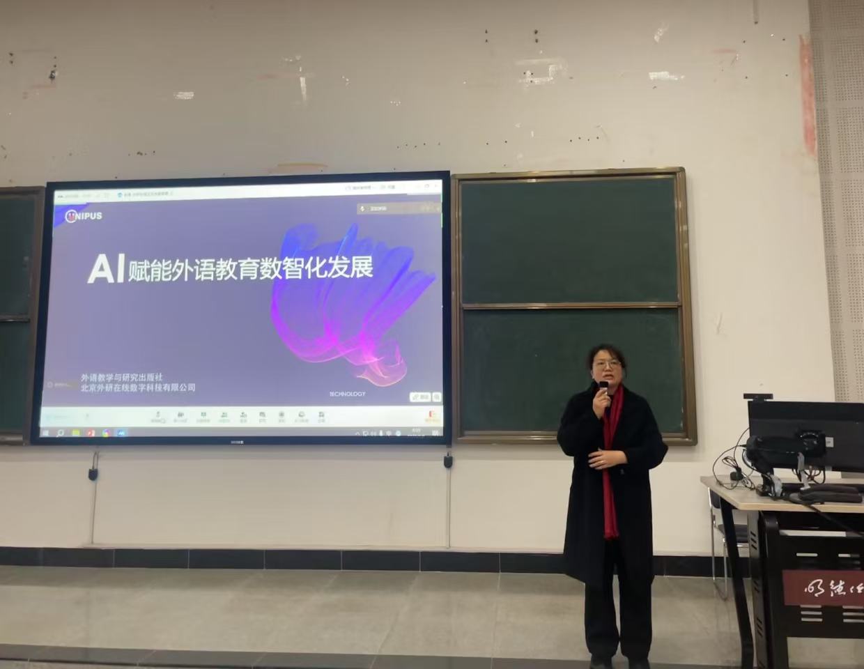 会议第一阶段是面向全院教师的Unipus智慧教学平台赋能大学外语教育教学实践操作培训。外研在线数字科技有限公司相关技术人员和课程开发负责人以“AI赋能外语教育数智化发展”为主题,详细讲解了U校园AI版赋能学、练、测、评一站式交互体验和智慧教学,为高校外语教学提供混合式教学解决方案。