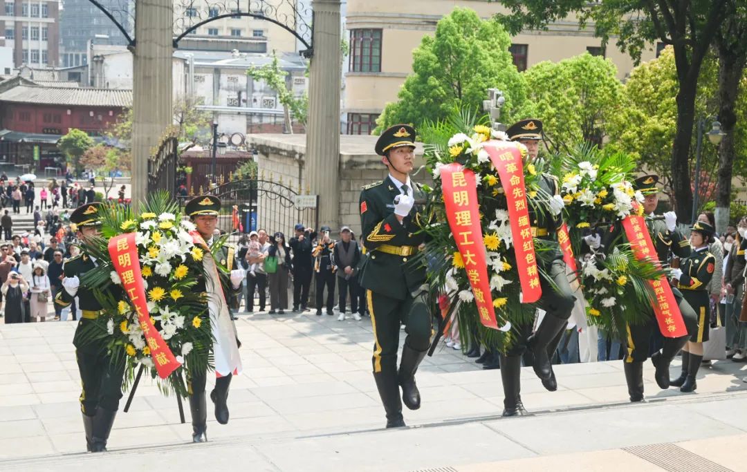 全体人员抵达云南抗战胜利纪念堂后,与昆明理工大学学生处(学生工作部、武装部)及戎光国防教育社团师生代表一同开展“缅怀革命先烈,传承革命精神”清明祭英烈活动,活动在庄严肃穆的氛围中拉开序幕,纪念碑前全体肃立,奏唱国歌,鲜花献烈士,壮歌慰忠魂,深切表达师生们对革命英烈的崇高敬意。