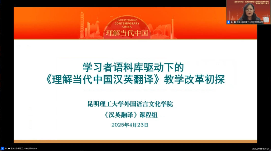 “理解当代中国”汉英翻译课程教学团队王英教授应邀参会,并作题为“学习者语料库驱动下的《理解当中国汉英翻译》课程教学改革初探”的学术报告,围绕“理解当代中国”英文系列课程建设与教学改革的主题与全国各高校参与教研室活动教师进行交流。