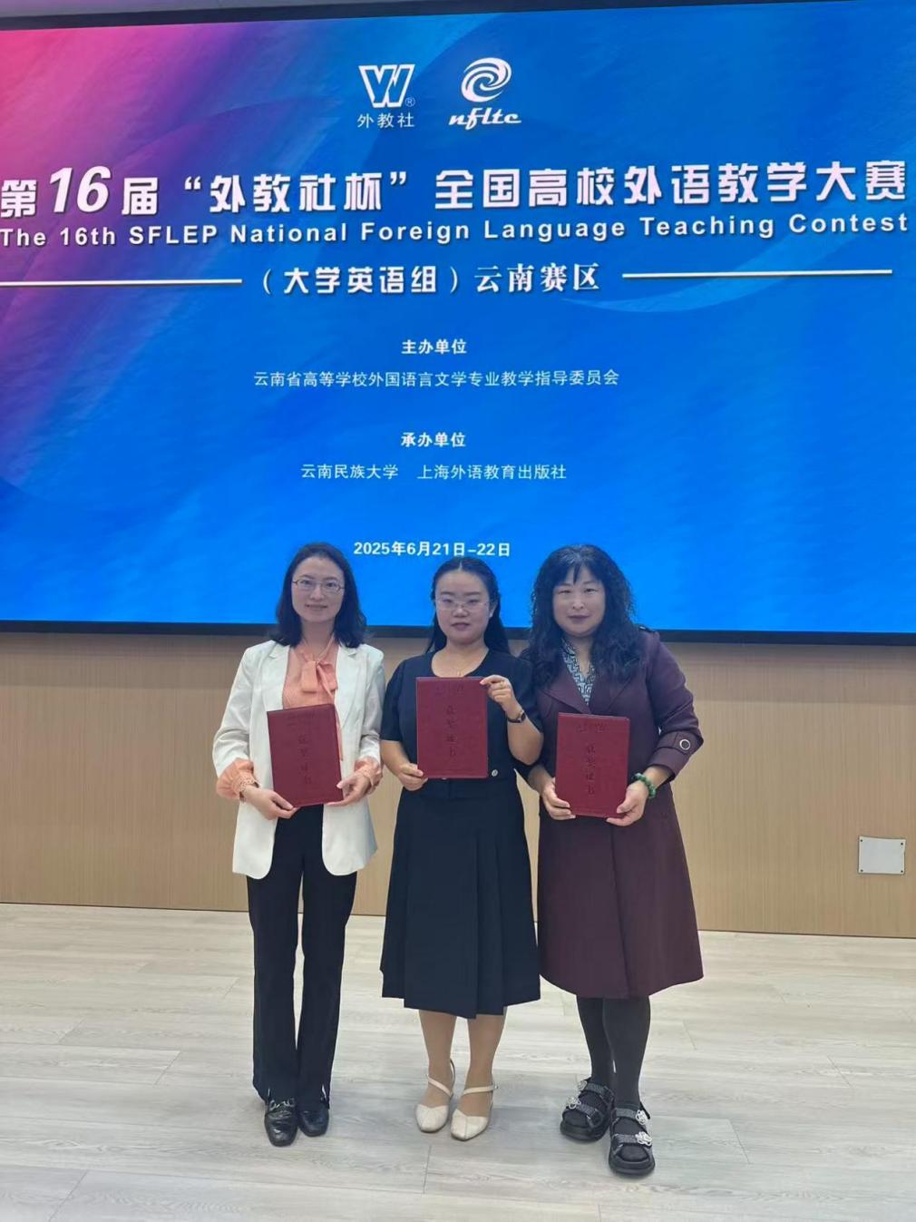 2025年6月20-22日,第十六届“外教社杯”全国高校外语教学大赛云南赛区决赛在云南民族大学举行。本届比赛下设大学英语综合课组和大学英语视听说课组。初赛环节包括现场授课、教学设计展示,决赛环节包括指定材料限时说课、专家提问。我校皇冠博彩app下载