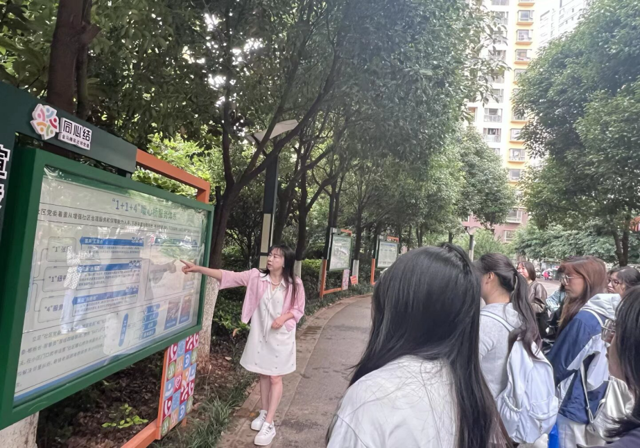 6月30日上午,实践团队首站走进昆明市官渡区金马街道东骧社区,深入了解基层治理模式。东骧社区党委书记李玲玲介绍了该社区独具特色的“1+1+4”暖心桥服务体系以及精细化网格治理模式等内容,向师生团队详细讲解了社区如何通过坚持党建引领、聚焦重点群体需求、整合各方资源等方式,探索构建新型社区服务模式,全方位践行“为人民服务”的宗旨与理念,不断赋能基层治理。