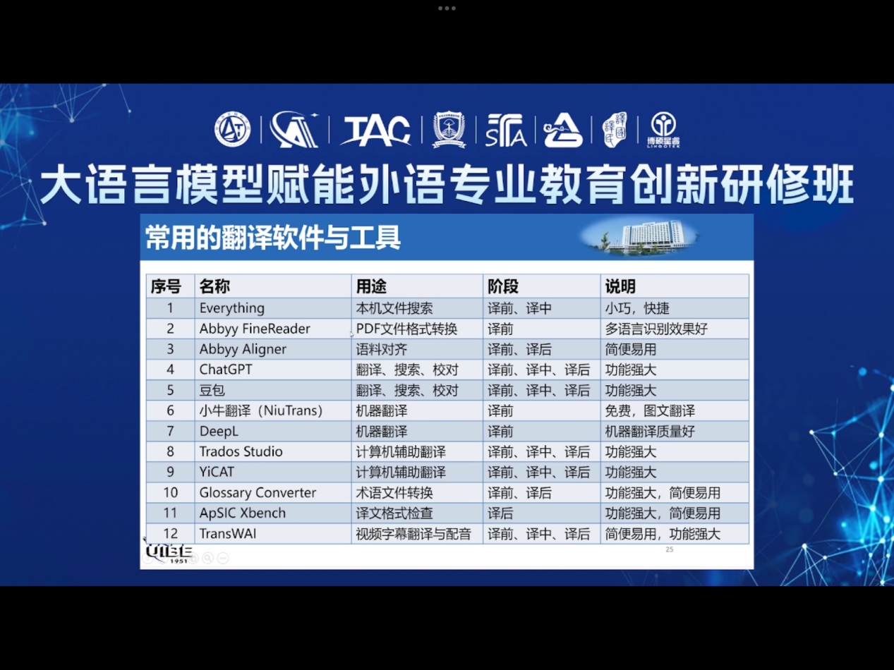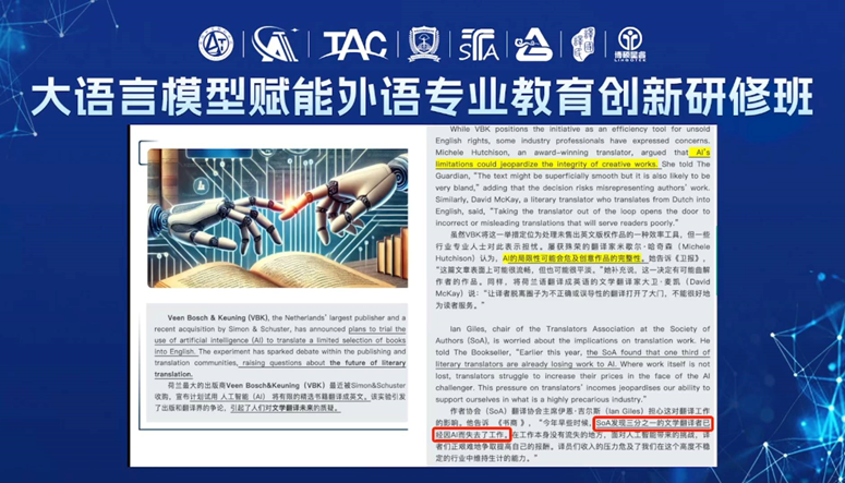 以及国内多家知名语言服务企业共同举办。研修内容聚焦“技术赋能、人文守正”主题,聚焦大语言模型赋能外语专业教育发展、翻译实践、教学设计、科研实践等专题模块,共话大模型时代政产学研协同创新翻译教育新图景,通过专家理论精讲、行业场景实训、高校案例分享以及圆桌沙龙讨论等多元形式,着力提升外语教师AI技术应用能力与数字人文素养。