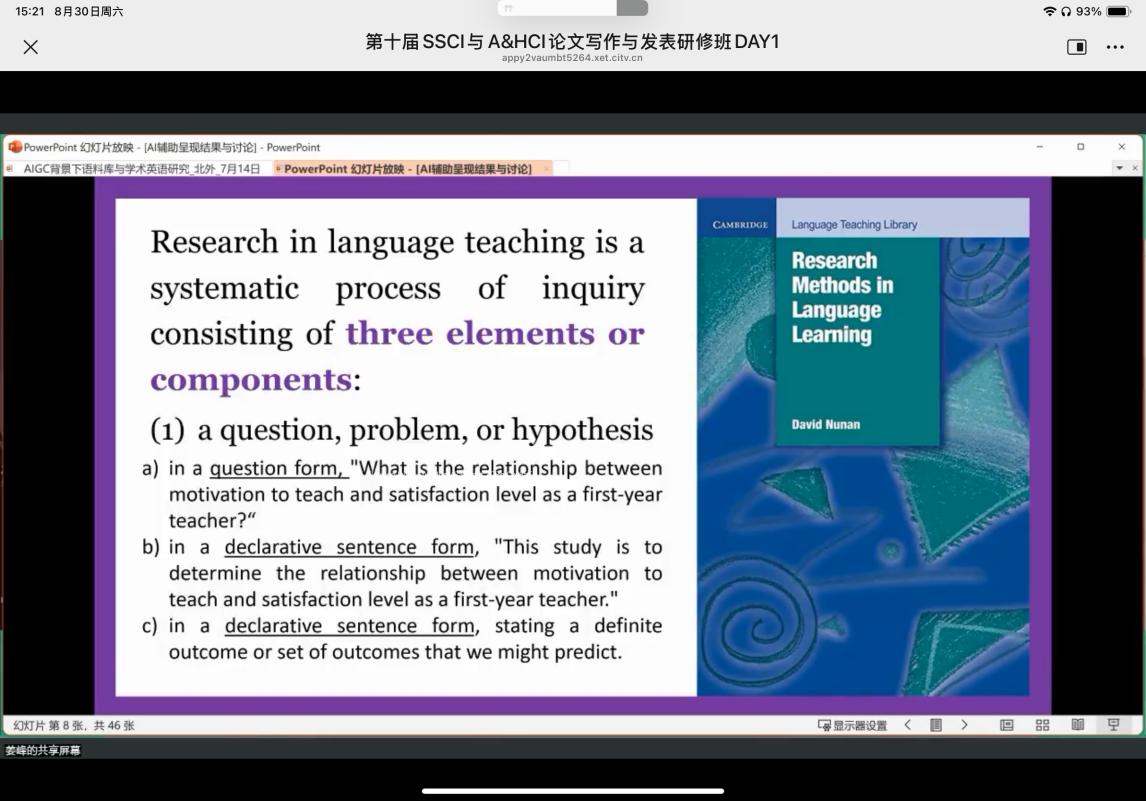 北京外国语大学徐浩教授围绕《“我是怎样做研究的”——AI辅助呈现质化研究设计与结果》展开讲解,突出质性研究中论点与论证的核心地位,系统阐述AI在研究设计和论点写作中的实用策略,结合实例帮助听众掌握应用方法,提升研究效率,并就防范相关技术风险进行提醒。
