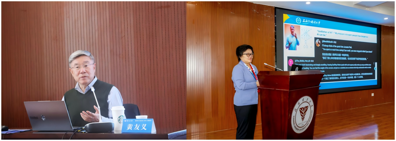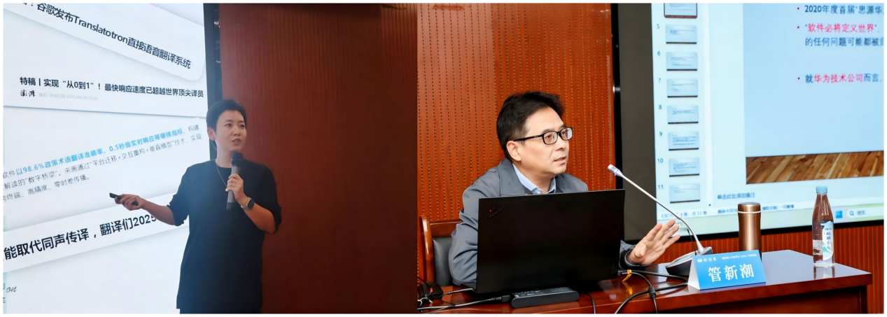 管新潮分别围绕“从‘翻译世界’到‘翻译中国’——培养融通中外的高端翻译人才”“新时代背景下的MTI教育——理念与路径”“以AI助力翻译实践,迎接翻译的高端时代”“MTI毕业设计探索——翻译报告撰写与案例分析”“AI时代的口译教学与测评”“AI赋能翻译技术教学实践”等主题开展专题授课。