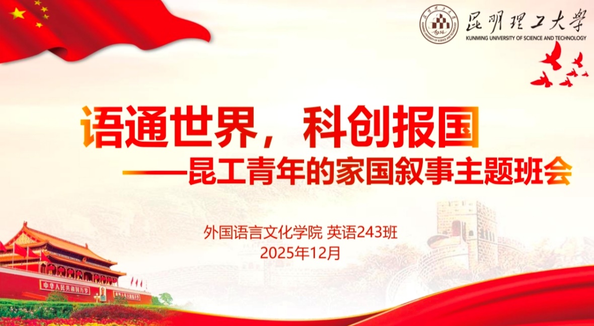 本次获奖班会在班主任茶秋思老师的悉心指导下,凝聚了243班全体同学的智慧与心血。班会以“语言-生活-榜样-使命”四重递进式体验为核心,创新设计了“双语解码家国情怀”“科技点亮幸福生活”“昆工榜样爱国答卷”“师长寄语明向领航”四大环节,将外语专业特色与思政教育深度融合。活动中,同学们通过双语翻译挑战解码中国理念,以英语演讲分享高铁、北斗、移动支付等科技成果带来的生活巨变,通过自制英语短视频展现本校科学家扎根科研、报国为民的动人故事,在沉浸式体验中深化了对新时代爱国主义的理解,明晰了青年学子的责任担当。