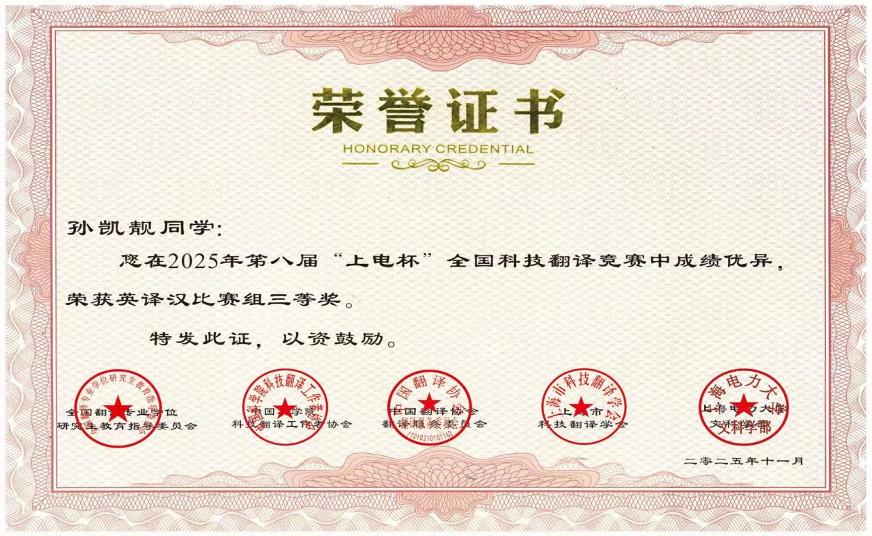 同时,在2025年第八届“上电杯”全国科技翻译竞赛中,2024级翻译硕士孙凯靓同学表现优异,荣获汉译英比赛组三等奖。“上电杯”全国科技翻译竞赛以考察科技前沿领域的专业翻译能力而著称,对参赛者的专业词汇量与逻辑严密性要求极高。孙凯靓同学在该赛事中脱颖而出,不仅体现了其出色的科技英语应用水平,也展现了我院在培养“外语+专业”复合型翻译人才方面的显著成效。