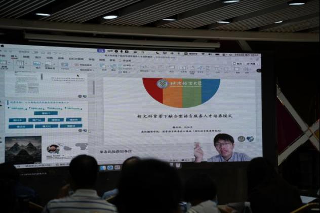韩林涛博士在英国线上参会。他的发言以《新文科背景下融合型语言服务人才培养模式》为题,探讨了在新文科背景下融合型语言服务人才培养模式、路径和体系。语言服务与传统的外语和翻译既有传承,也有创新。其独特之处体现在“融合”上。报告围绕如何根据市场需求设计培养方案,如何解决外语学科与专业的有机融合,如何通过政产学研一体化融合驱动语言服务课程体系升级,先前的探索如何在新文科背景下形成体系和模式等问题进行思考。
