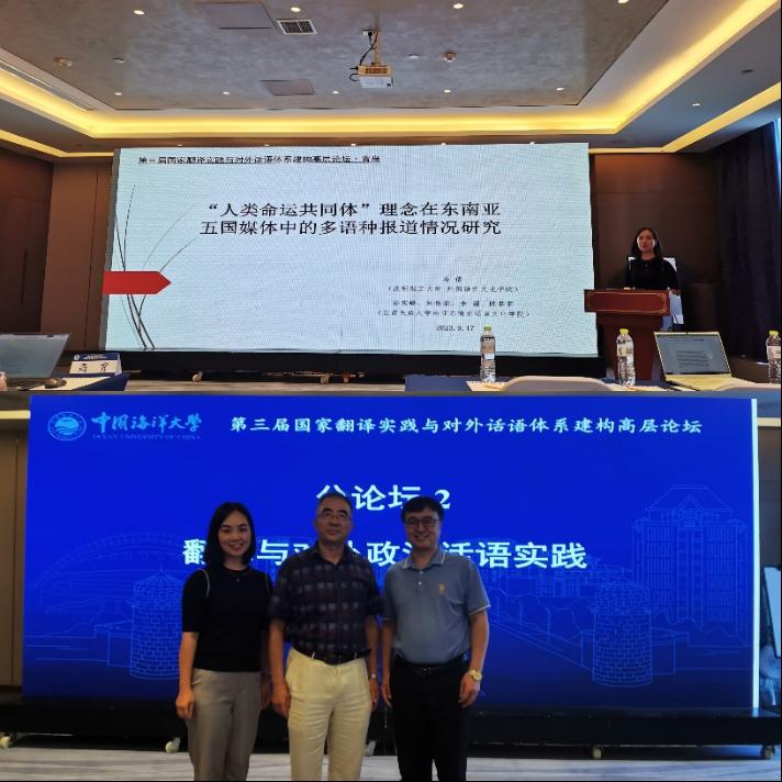 论坛设“翻译与国家治理”“翻译与对外政治话语实践”“翻译与对外文化话语实践”“中国特色翻译理论话语研究及其他”四个分论坛及“主编与青年学者面对面”特邀环节,来自全国各高校相关领域的学者共同探讨国家翻译实践与国家对外话语传播议题。我院马倩老师参与了“翻译与对外政治话语实践”分论坛,基于所主持的国家社科基金项目“东盟国家对中国‘和合’话语的认知和影响因素研究”的阶段性研究成果进行了汇报分享,发言题目为“‘人类命运共同体’理念在东南亚五国媒体中的多语种报道情况研究”,就相关研究发现和下一步研究计划同参会的专家同行进行了交流探讨。