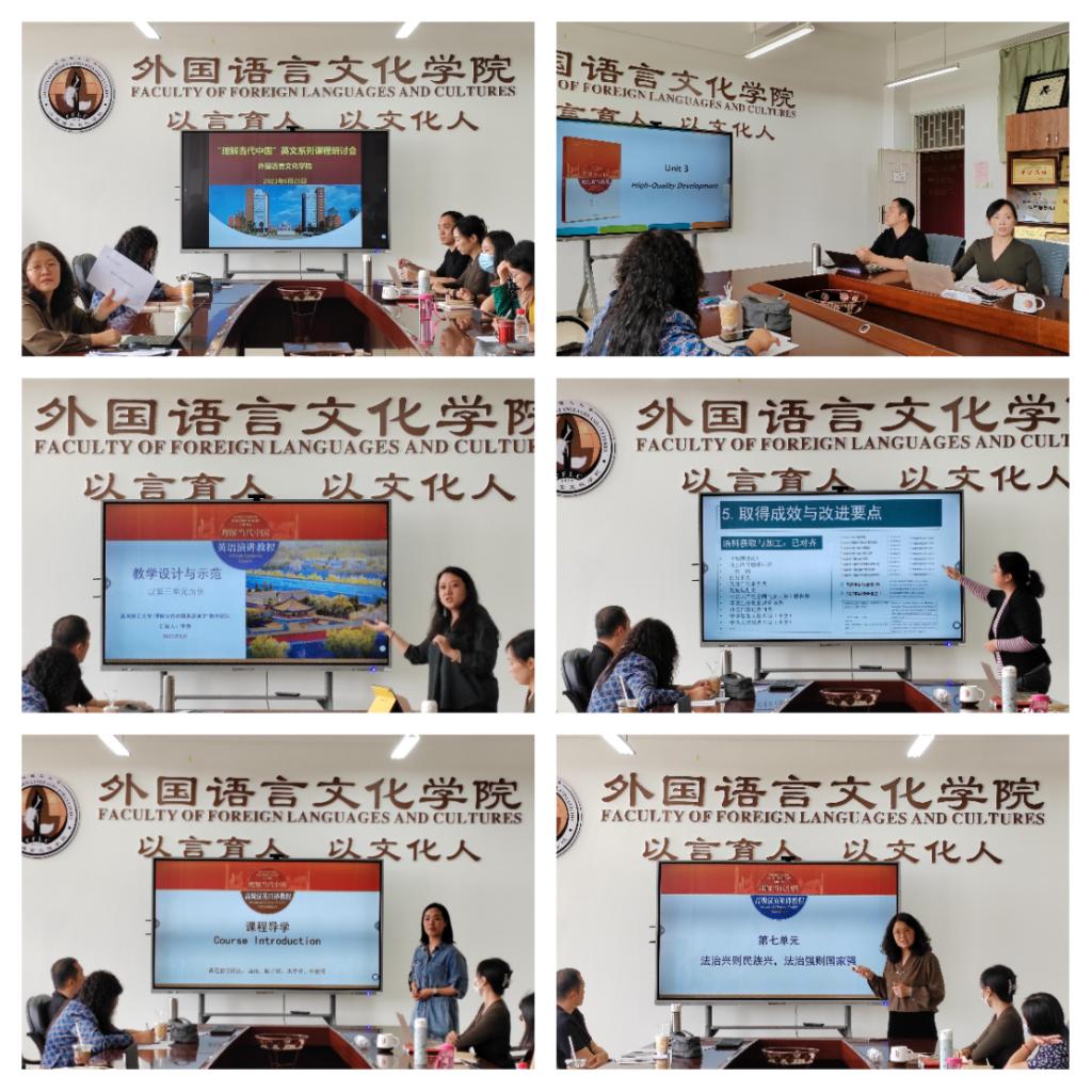 研讨会上,“理解当代中国”英文系列课程各团队负责人依次汇报了五门课程的建设情况。《高级英语读写》课程团队负责人高维老师以教材第三单元“High-Quality Development”为例展示了基于Bloom教育目标分类法的单元设计思路,通过提升英语类本科专业三年级学生的思辨能力、理论素养和用英语讲好中国故事的能力实现语言目标和理论、思辨、传播意识等育人目标。