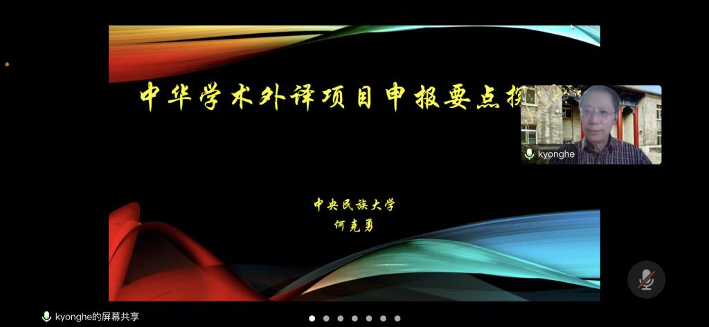 何克勇教授从宏观到微观,著作来源、译者及其团队优势、翻译语种等方面,启发人文社科教师结合自身资源选择著作,并从中华学术外译项目的宗旨出发,介绍如何选择国际主流学术出版商,更从近年成功案例出发,介绍选题目录、译者职责、团队组建的关注重点。这次讲座引起了现场的,教师们对中国学术外译项目有了更全面的了解,纷纷就选题目录、项目评审等问题向何教授咨询请教,并表示受益匪浅。洪涛副教授结合自身成功申请经验,从选题、联系国内外出版社何作者授权、个人简历与翻译样章准备到申请书撰写,言简意赅地介绍了中外学术外译项目,线上讨论氛围非常热烈。
