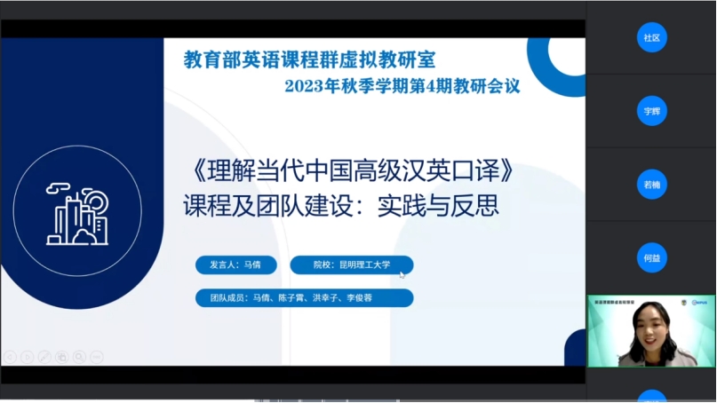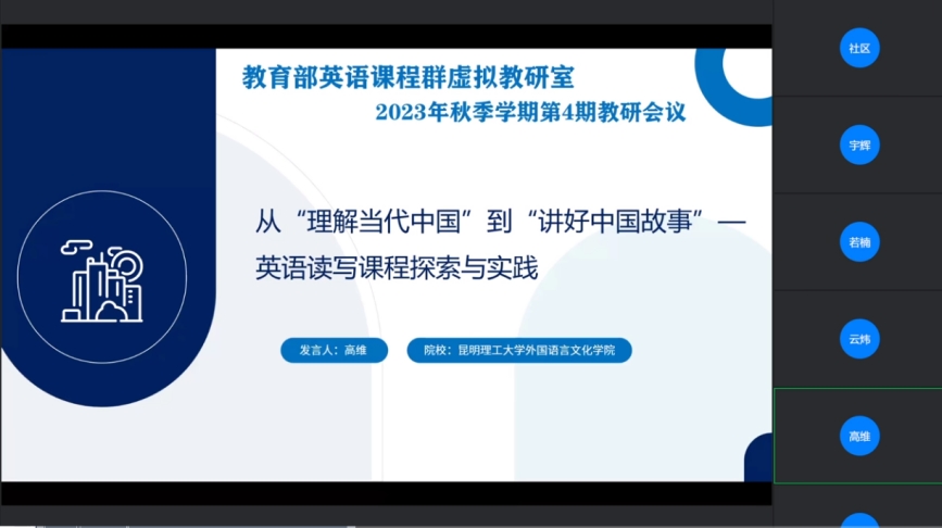 12月28日,教育部“英语课程群虚拟教研室”2023秋季学期第4期教研会议在线上召开,我院“理解当代中国”系列课程教学团队高维、马倩两位老师应邀参加说课分享,围绕“理解当代中国课程建设”这一主题与全国各高校百余名参与教研室活动的教师进行交流。