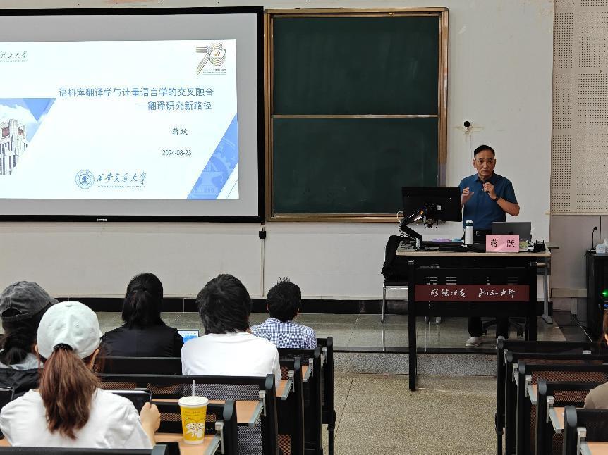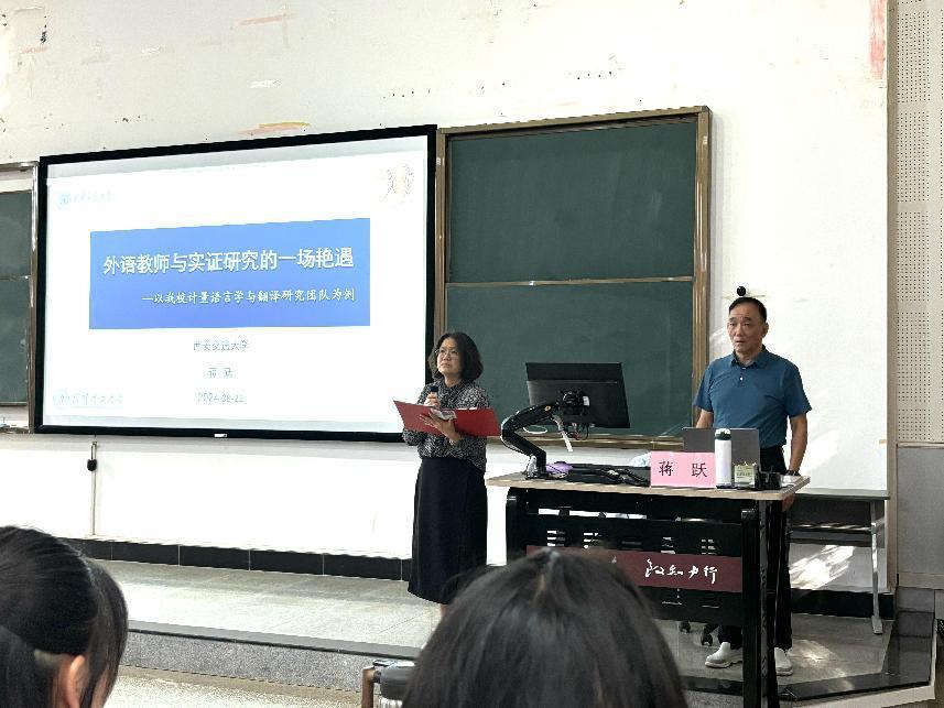 首场讲座,蒋跃以“外语教师与实证研究的一场艳遇——以西安交大计量语言学与翻译研究团队为例”为题,介绍了自己的团队如何活用计量语言学理论,并结合当下国内外相关领域研究现状,在国外核心期刊发文的经历。通过实例引导硕导们如何在语言学领域研究上取得新突破,寻找新方向。在第二场题为“语料库翻译学与计量语言学的交叉融合——翻译研究新路径”的讲座中,蒋跃从语料库与计量语言学的微观角度出发,将语料库翻译与计量语言学相关定律相结合,将研究问题量化、具象化,并通过多个案例分析,展示了两者交叉研究的科学性和实际价值。