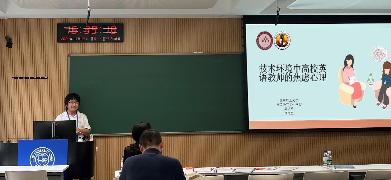 在“技术环境中的外语教师情感与认同”分论坛上,董雨晨做小组发言“技术环境中高校英语教师的焦虑心理”。该报告基于参与式观察、非结构化访谈和文献分析等社会学调查研究结果,从霍妮(Karen Horney)的社会心理学理论出发,展示了在AI和翻译软件不断发展的环境中高校英语教师面临的职业压力和焦虑心理。该报告丰富了当前教师心理学领域的研究,可为技术环境中教师心理健康和职业发展问题提供有益启示。与会专家对发言做出高度评价,认为该报告选题新颖,内容扎实,并期待将来皇冠博彩app 能在外语教师职业发展领域取得更加丰硕的成果。