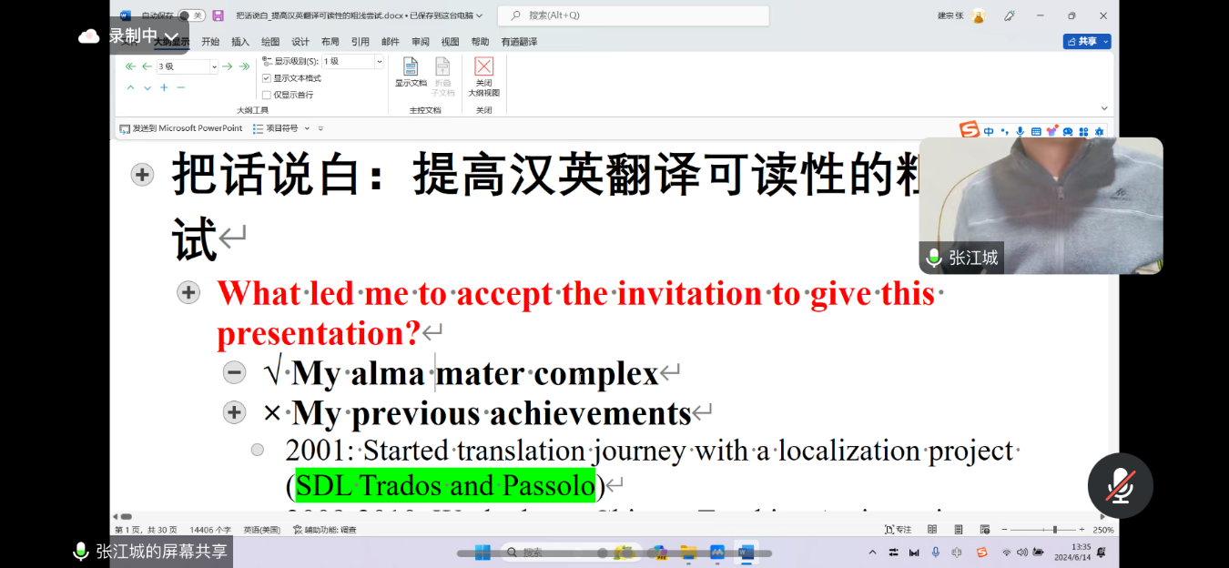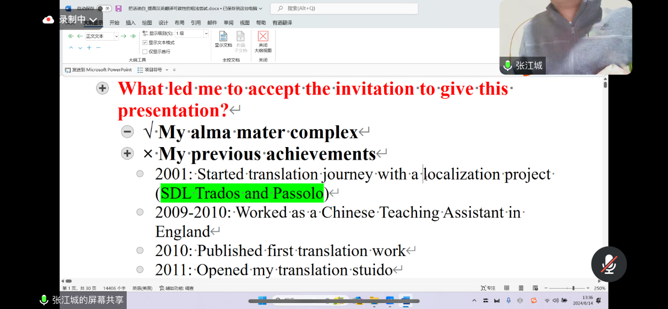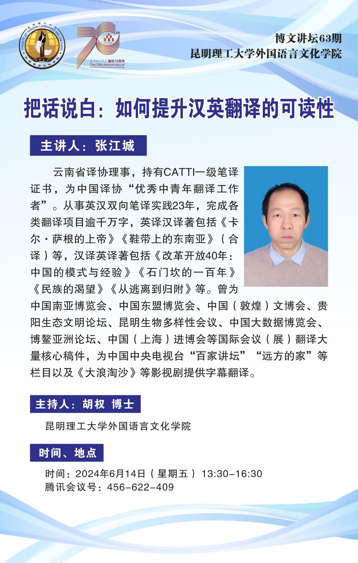 6月14日,皇冠博彩app下载 邀请云南省译协理事张江城在线开展题为“把话说白:如何提升汉英翻译的可读性”的讲座,会议由胡权博士主持,皇冠博彩app 本科生、研究生共计150余人参加。