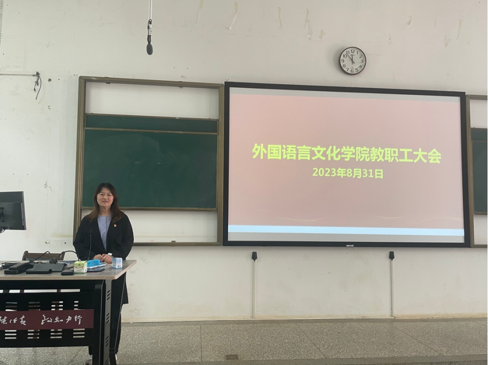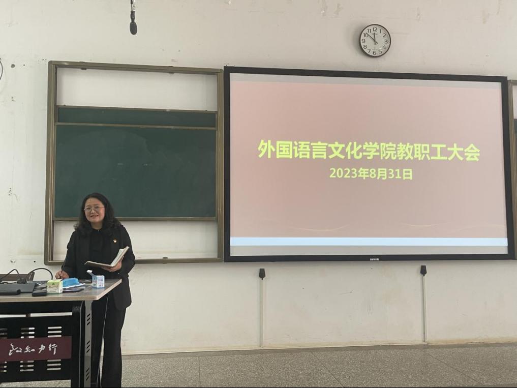 科研的软实力。杨玲副院长针对大学英语教学改革工作做了汇报,介绍了现阶段取得成果。计划不断完善大学英语教学指南以及教学大纲,组建学术英语提升教学团队,进一步推进课程质量档次以及一流课程申报等重点工作。马倩副院长围绕2023版培养方案修订工作,学科大赛的安排筹备组织工作,英语类专业学生的深造率提升和四八级过级率提升专项工作,本科专业建设等方面进行展望,希望与教职工同心同德,探索切实有效的工作方案,共同努力推进各项任务的开展。
