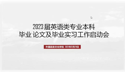 领导、英语系全体教师、2023届本科生、学工办、教务办相关管理人员,以及校企合作实习单位代表约130余人参加了线上会议。会议由英语系主任任佳佳主持。
