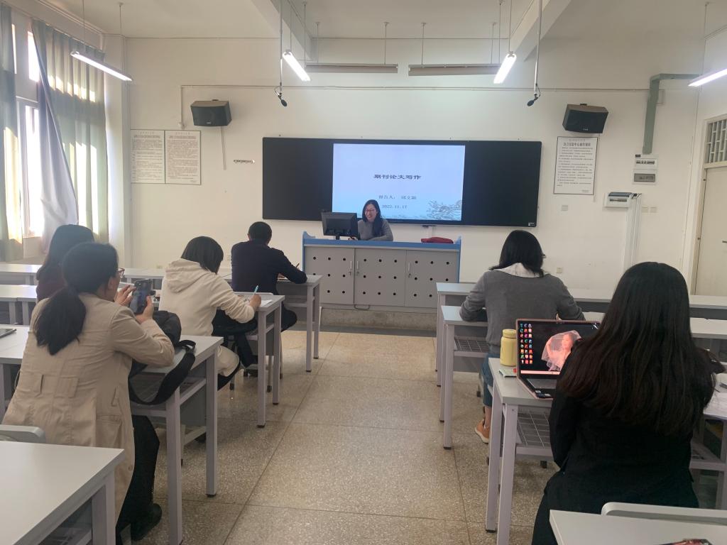 来自大学外语部的邱文颖老师以《期刊论文写作》为题,和在场老师们分享了她关于中文核心期刊发表的历程和经验。邱老师首先就文章选题的前沿性、精深性和系统性进行阐述,然后以自己已发表的核心期刊论文为例从论点、摘要、正文和结论分别介绍了期刊写作要点。最后,详细解释了核心期刊匿名评审的步骤以及应对技巧。邱老师的经验分享非常实用,得到在场老师们的赞赏。
