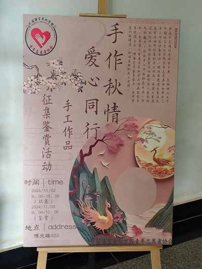 青年志愿者协会在博文楼403举办了主题为“手作秋情,爱心同行”的手工作品征集活动。此次活动旨在让参与者在动手实践中感受秋天的美好,同时激发大家的爱心与责任感,将秋天的温暖传递给山区的儿童。