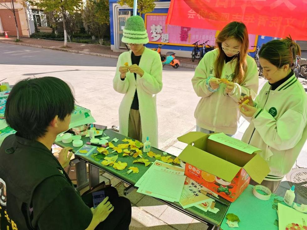 同时,在活动板块二“秋日手工”处,不少参与者利用落叶制作出那一份份属于“秋天的印记”。在活动三“公益互动”环节,同学们用颜料将自己的指印或掌印轻按在大树周围,象征着大树逐渐长满了五彩缤纷的叶子,也象征着我们此次慈善公益事业的蓬勃发展。