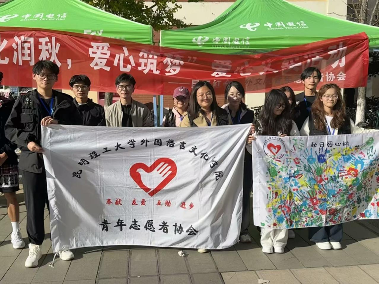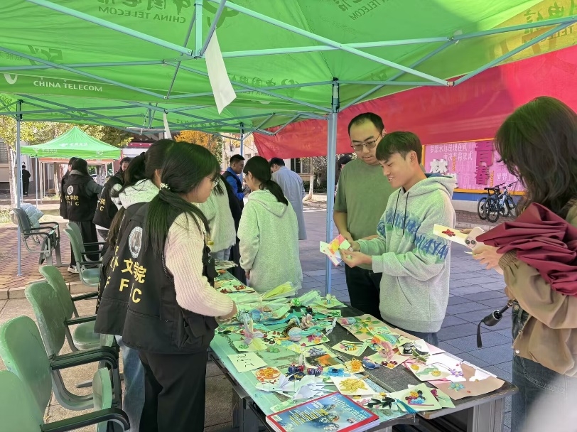 青年志愿者协会联合昆明理工大学红十字会在憬园小广场举办了“文化润秋,爱心筑梦”爱心义卖活动,此次活动分为“爱心义卖、秋日手工、公益互动”三个模块,旨在通过同学们的双手和心灵,传递温情与力量,为山区的孩子送去同学们的爱心与关怀。