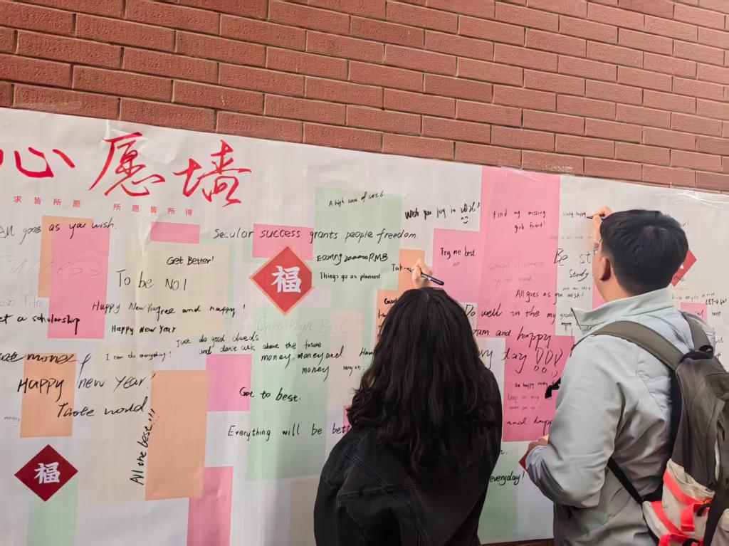 活动精心设计了四个兼具趣味性与知识性的环节。在“英语新年愿望书写”区,同学们在主题签名墙上用英语写下了对新一年的祝愿与期盼。“英语灯谜竞猜”区人气高涨,参与者从题库中自由选择谜题进行解答,每猜对一题即可累积积分,用于兑换精美小礼品,现场互动热烈,充满了挑战与乐趣。